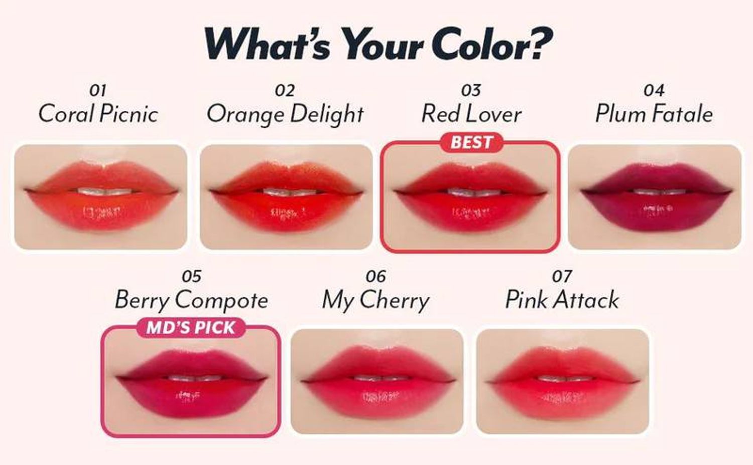 I'M MEME Color Key Ring Water Gel Tint нь уруулд шингэх мэт уусдаг, чийглэг, гялалзсан өнгөтэй усан гелэн бүтэцтэй tint юм.