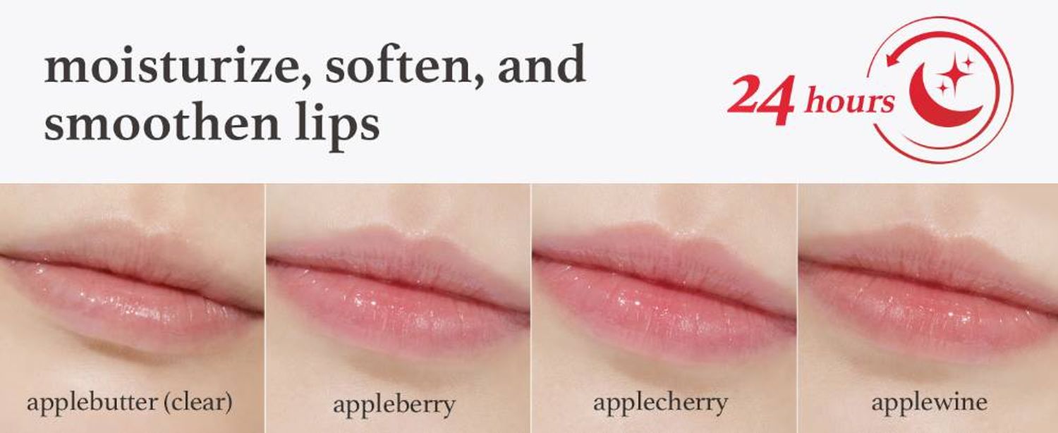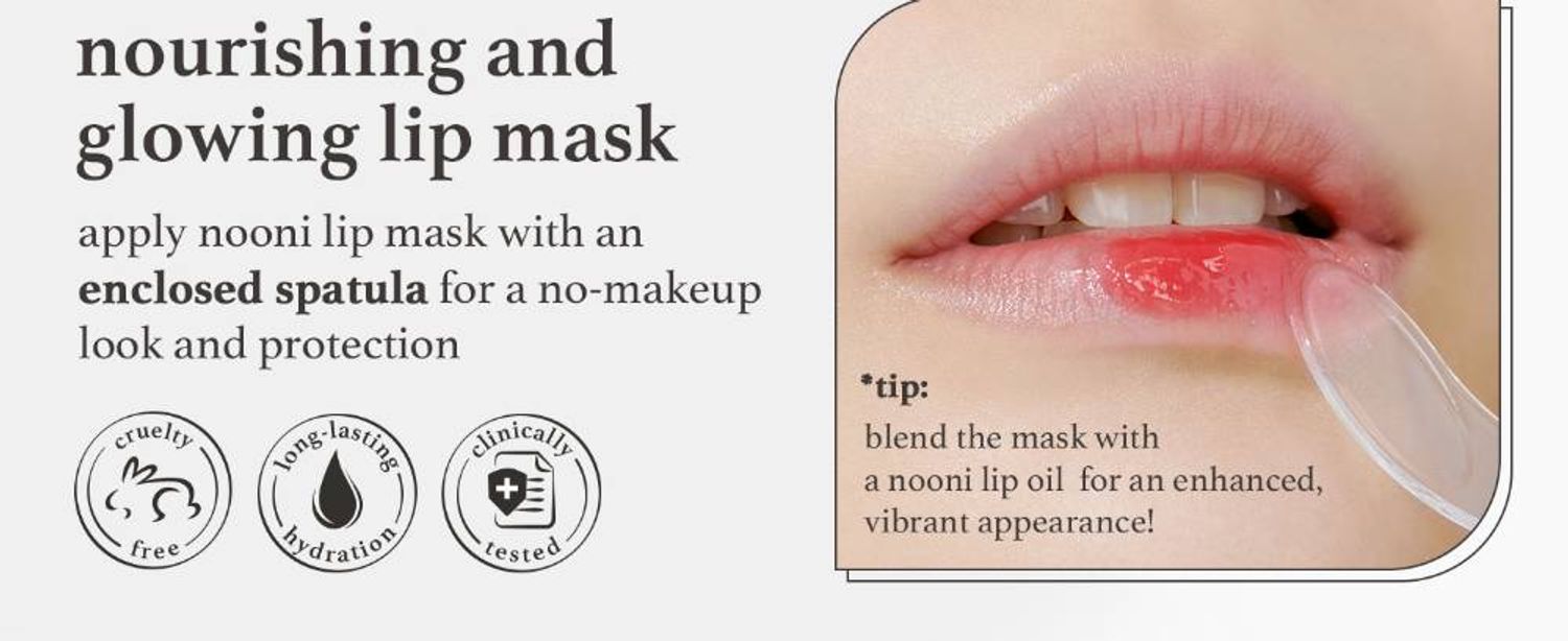 NOONI APPLECHERRY өнгөтэй уруулын маск: алимны үрийн тос, ши тос, жимсний ханд агуулсан тус маск нь уруул дээр жигд түрхэгдэж, хуурай ан цавыг толигор болгож, уруулыг гүн чийгшүүлнэ.