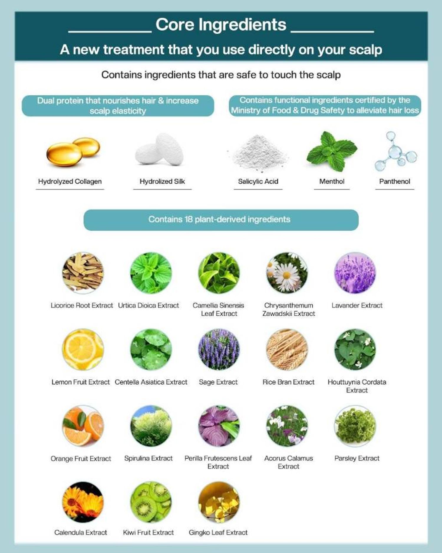 - 18 төрлийн ургамлын ханд: Үс болон хуйхыг тэжээлээр хангаж, эрүүл мэндийг дэмжинэ.